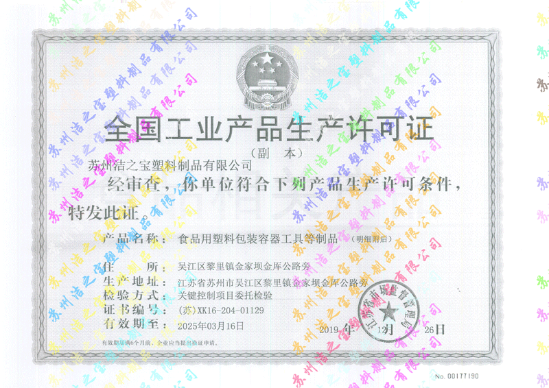 食品用塑料包裝容器證書